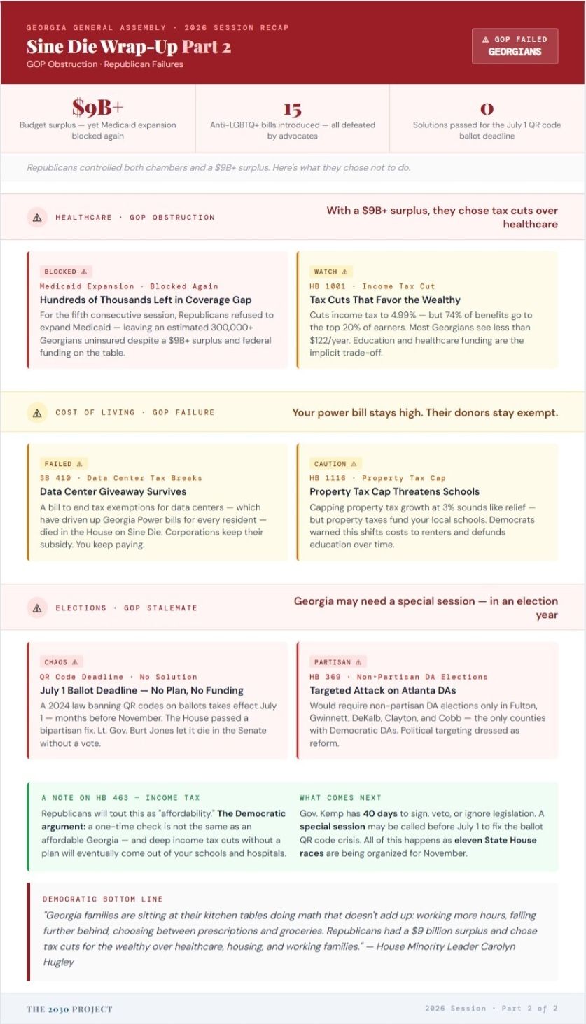 The consequences in November are real: voter confusion at the polls, inconsistent systems across counties, potential ballot invalidation, and a State Election Board empowered to prosecute officials for noncompliance with a standard that doesn't yet exist. Republicans created this deadline, failed to fund a solution, and are now leaving Georgia's election infrastructure in chaos heading into the most consequential midterm in a decade.