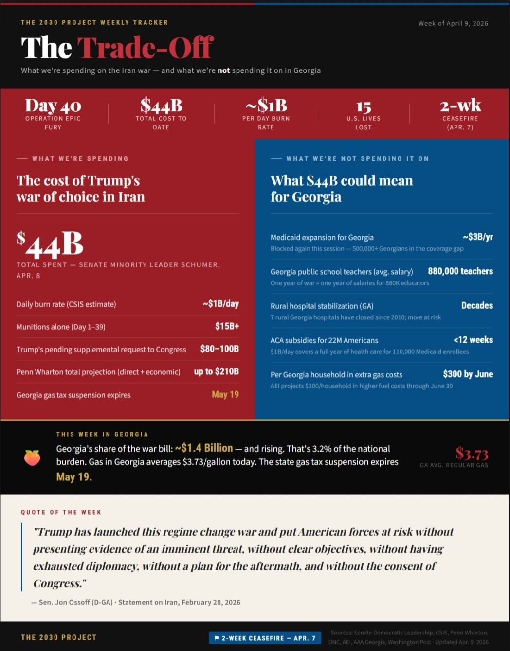 Forty days into Operation Epic Fury, the United States has spent $44 billion waging Trump’s unauthorized war in Iran that was launched without congressional approval without a clear endgame. Fifteen American lives have already been lost, and the human cost in Iran is staggering. As Congress weighs an $80–100 billion supplemental request, Georgians are left asking: what could that money have done at home? The infographic below breaks down the trade-off.