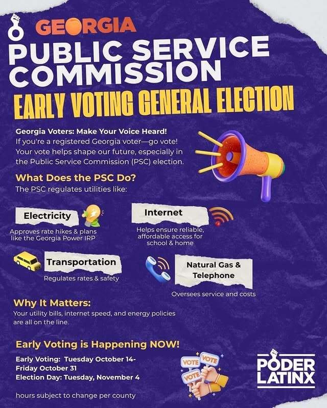 This election matters. Early voting ends Friday, October 31st, and Election Day is November 4th. As a reminder, the PSC Elections are Statewide, this means every Georgia voter can vote in BOTH elections. Georgians deserve commissioners who will stand up for the people—not powerful utility companies or special interests. Our leaders should fight for affordable energy, transparency, and a clean, sustainable future for everyone in our state.